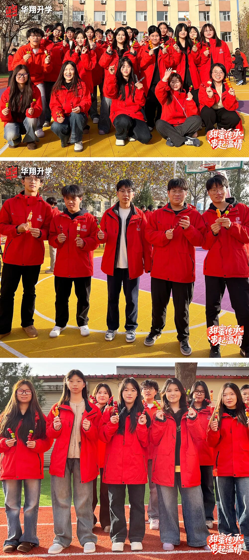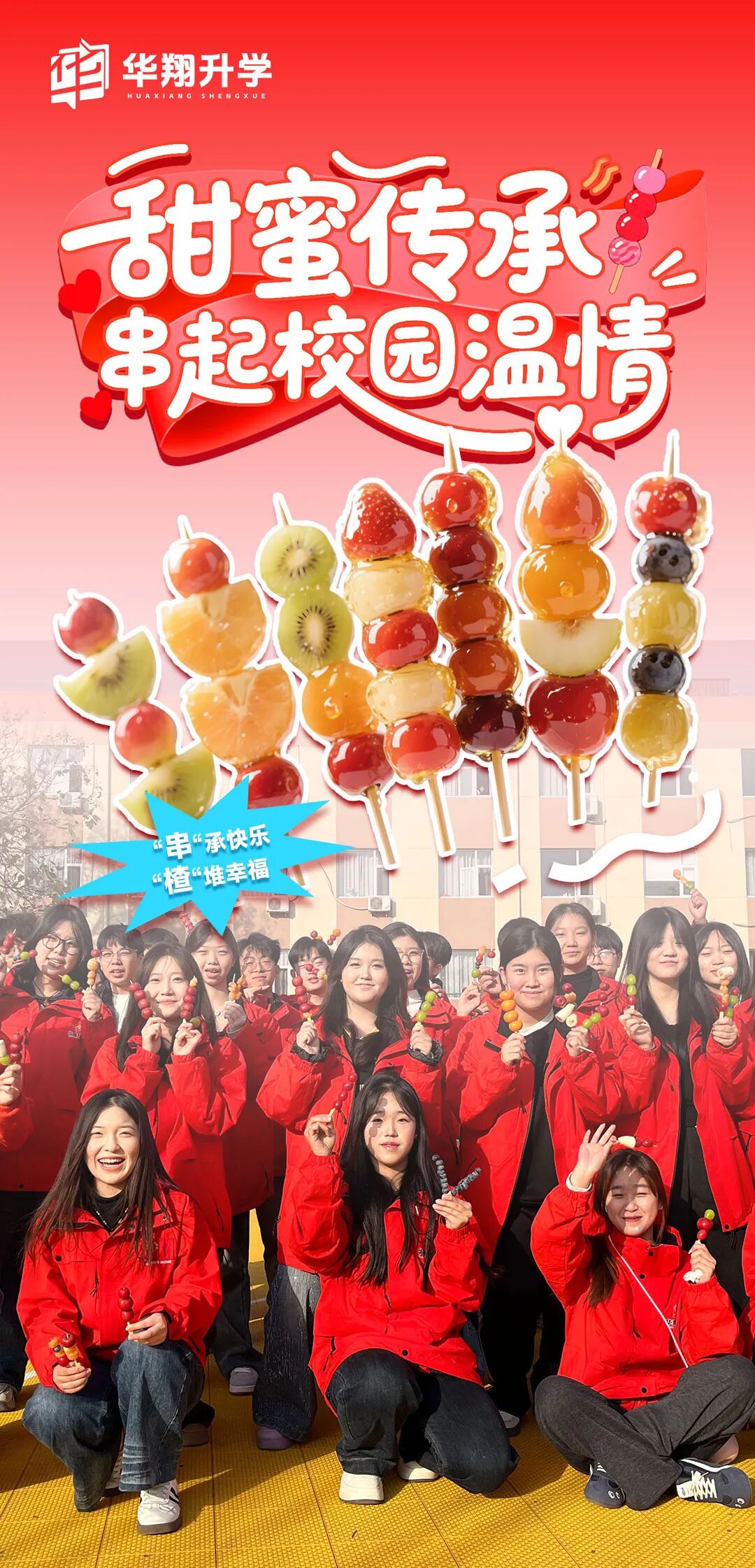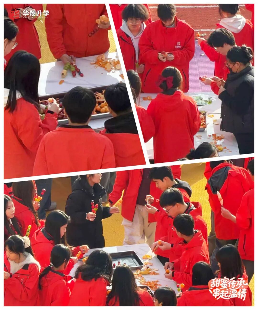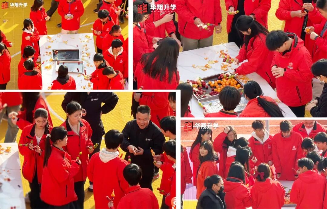 华翔教师与全体学员共同参与, ❤️以传统美食为纽带,在酸甜滋味中 传递文化温度与校园温情, 🌟展现了以文化人、以美育人的教育理念。 活动不仅备有经典山楂, 更创新搭配橘子、葡萄、香蕉 等多元鲜果, 既保留传统风味, 又注入青春活力, 让这一传统小吃焕发新的生机。 文化分享环节, 华翔教师趣味解读糖葫芦发展史, 从宫廷药膳到民间小吃, 让学员沉浸式触摸文化脉络。 这种师生共融的文化传播模式, 有效增强了学子的文化认同与归属感。 以糖葫芦为载体, 让文化传承融入实践体验, 为校园文化注入了深厚底蕴, 让传统文化在校园落地生根。 清洗、串果、熬糖、蘸糖的实践中, 师生分工协作, 在锤炼动手能力的同时, 深化了耐心与协作意识。 学校以劳动教育为抓手, 让学员在实践中 体悟劳动价值与创造乐趣。 学员们发挥创意搭配鲜果色彩、 把控糖衣火候,打造出 各具特色的糖葫芦。 这种“在实践中成长”的模式, 让劳动成为滋养成长的快乐养分。 一串串晶莹糖葫芦的诞生, 不仅是劳动成果的展现, 更让“劳动光荣、创造伟大” 的理念深入人心, 成为校园教育的生动实践。 轻松的活动氛围搭建起 师生交流的桥梁, 鲜果甜蜜与协作温情交融。 学校以这类集体活动为纽带, 增进师生情谊与团队精神, 让校园充满温暖与归属感。 师生互赠糖葫芦的暖心瞬间, 定格成“温情校园”的生动画面, 让教育温度传递到每一位师生心中。 此次活动将文化、劳动、 情感教育融为一体, 为紧张的学习生活注入鲜活活力, 充分展现了学校多元化的 育人体系与深厚的文化底蕴。 未来,华翔升学 将持续推出更多优质活动, 以文化铸魂、实践赋能, 让每一位学子在温暖校园中成长成才, 让校园生活更加丰富多彩。