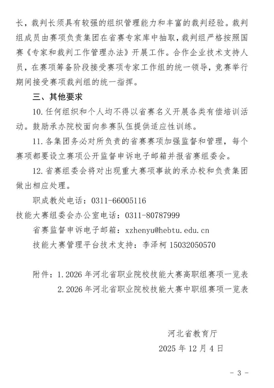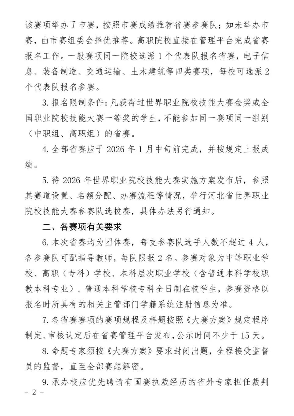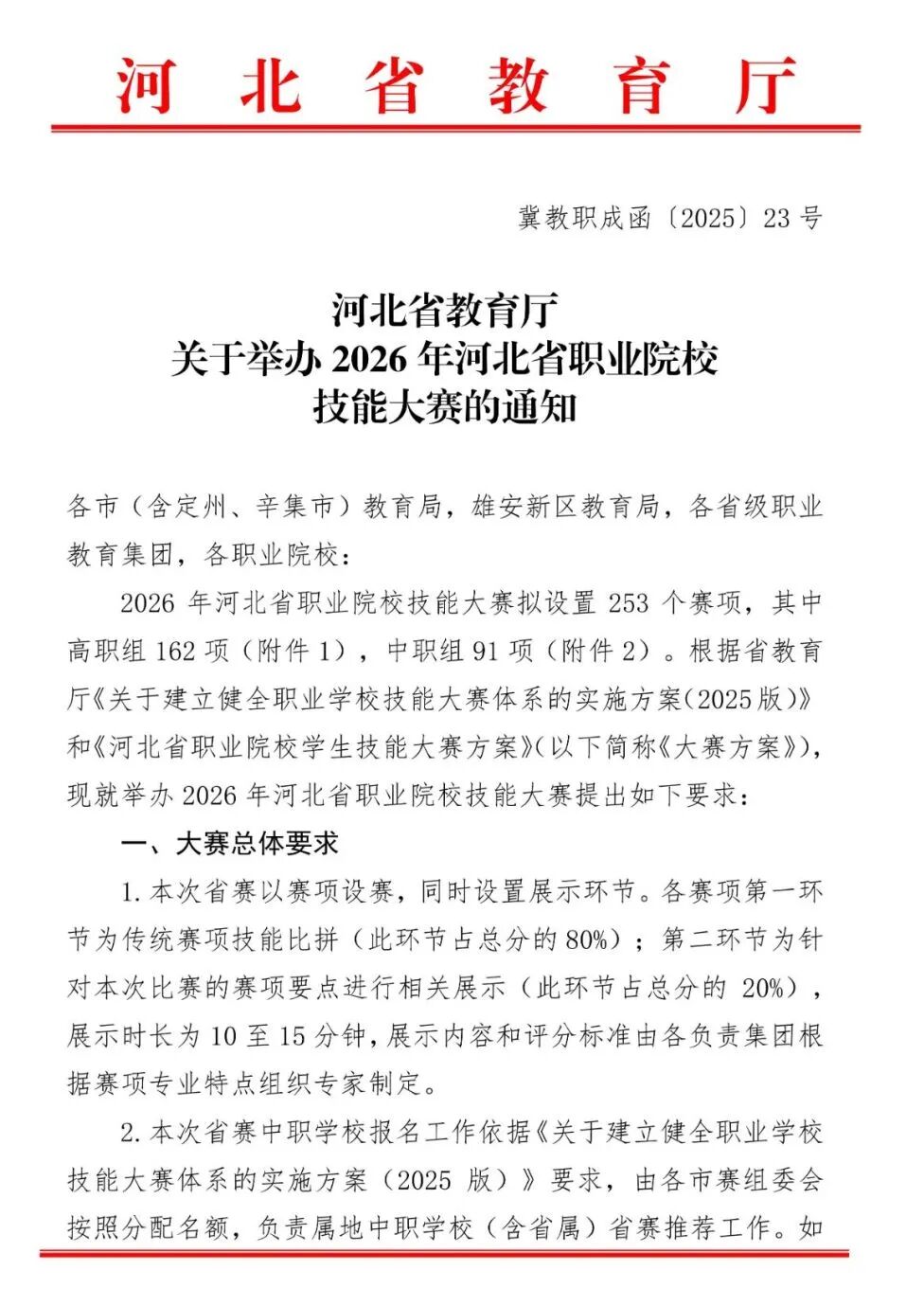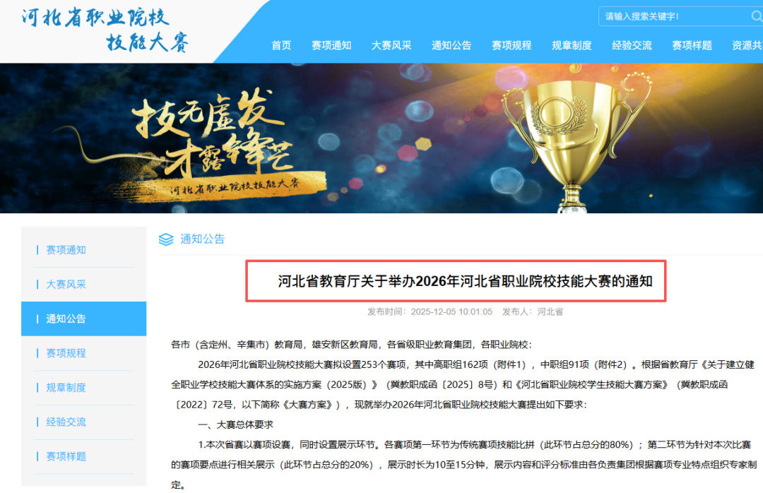 近期河北省教育厅发布了关于举办2026年河北省职业院校技能大赛的通知 2026年河北省职业院校技能大赛是由河北省教育厅主办的省级职业院校技能竞赛,涵盖高职组和中职组多个专业赛项。 大赛采用80%老赛制与20%新赛制结合的形式,具体赛项包括检验检疫技术、护理技能、航空服务等数十个领域。 比赛时间为2025年12月至2026年1月中旬。 获得省赛一等奖的可免试单招,二等奖、三等奖的只参加文化素质考试,职业技能考试部分,省赛二等奖的考生免试,直接赋满分,三等奖的考生可免试直接赋满分分值的90%,考生也可参加考试,按其较高分值计算职业技能考试成绩。